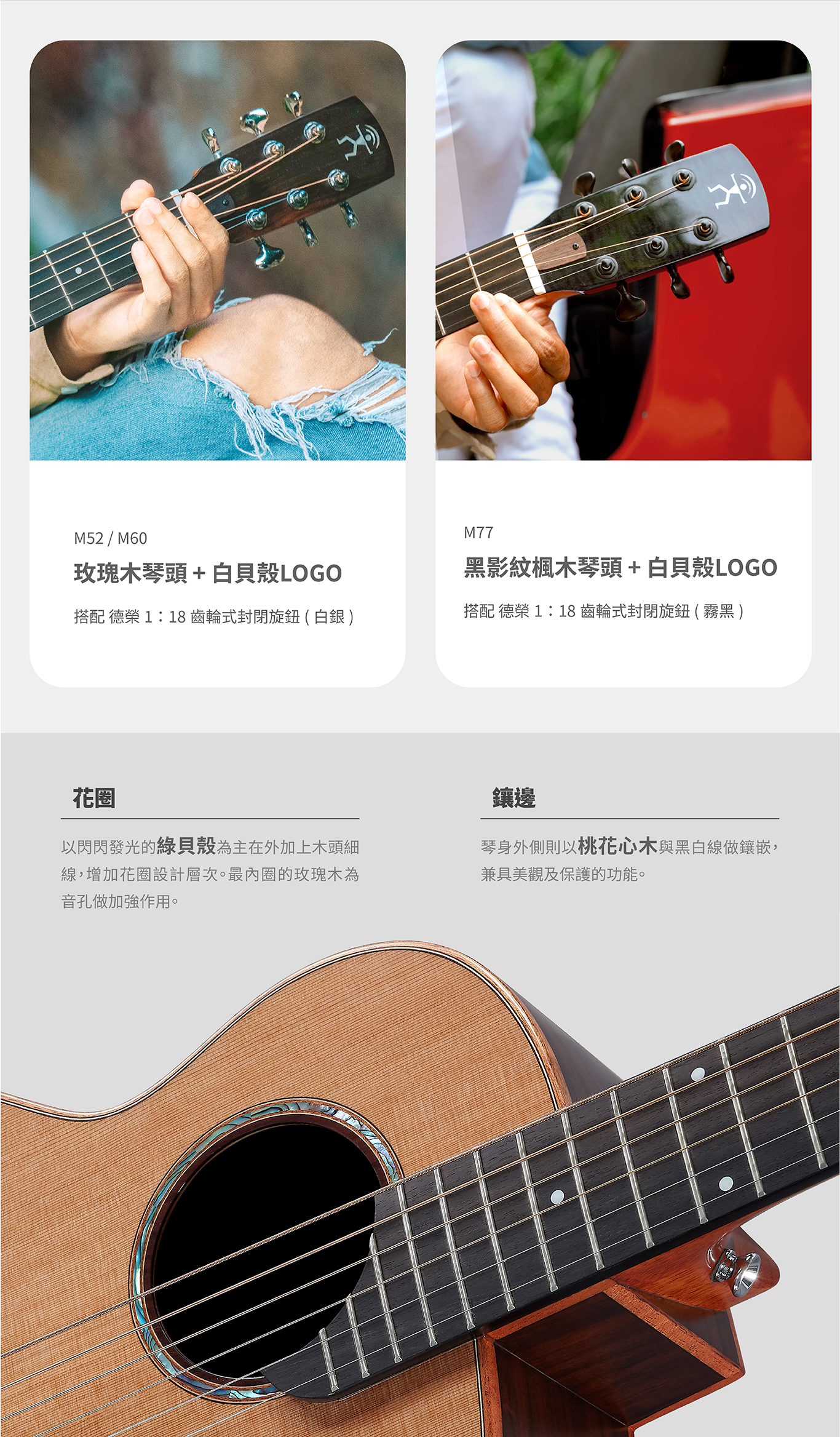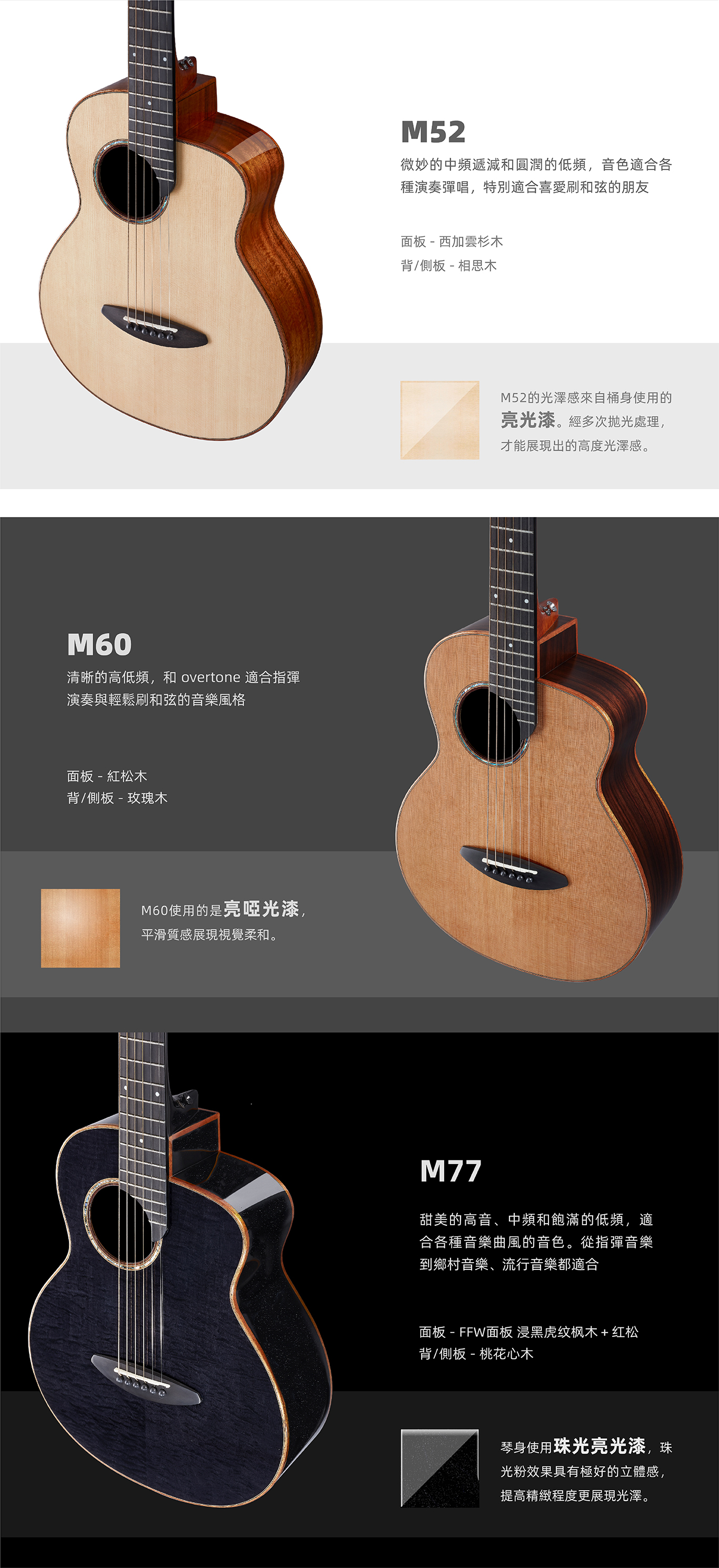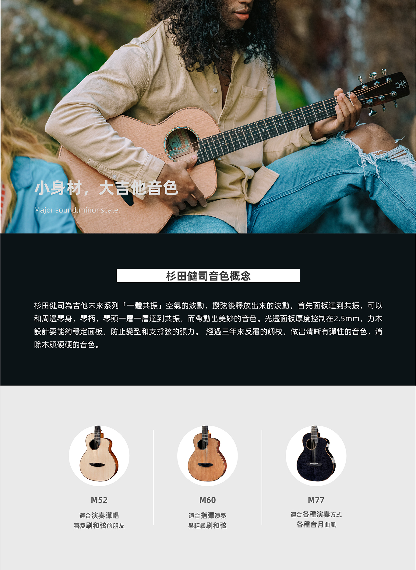 36吋的面單板旅行吉他,全新設計,讓琴的震動和諧,音色穩定,延音細膩,兼具舒適手感與聲音品質。